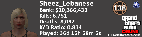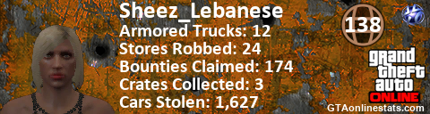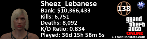 [URL=http://GTAonlinestats.com/showplayer/Sheez_Lebanese][IMG]http://GTAonlinestats.com/signature/Sheez_Lebanese/sig.png[/IMG][/URL]