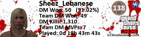[URL=http://GTAonlinestats.com/showplayer/Sheez_Lebanese][IMG]http://GTAonlinestats.com/dmsignature/Sheez_Lebanese/sig.png[/IMG][/URL]