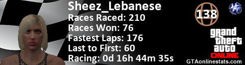 [URL=http://GTAonlinestats.com/showplayer/Sheez_Lebanese][IMG]http://GTAonlinestats.com/racesignature/Sheez_Lebanese/sig.png[/IMG][/URL]
