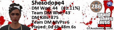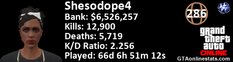 [URL=http://GTAonlinestats.com/showplayer/Shesodope4][IMG]http://GTAonlinestats.com/signature/Shesodope4/sig.png[/IMG][/URL]