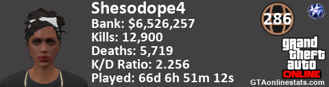 [URL=http://GTAonlinestats.com/showplayer/Shesodope4][IMG]http://GTAonlinestats.com/greysignature/Shesodope4/sig.png[/IMG][/URL]