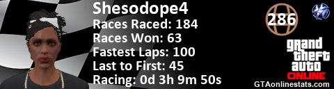 <a href="http://GTAonlinestats.com/showplayer/Shesodope4"><img src="http://GTAonlinestats.com/racesignature/Shesodope4/sig.png" alt="Shesodope4" border="0" /></a>