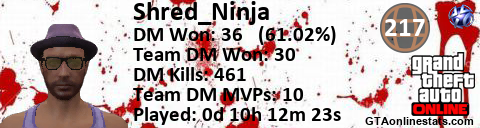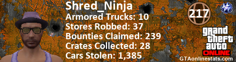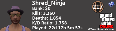 [URL=http://GTAonlinestats.com/showplayer/Shred_Ninja][IMG]http://GTAonlinestats.com/signature/Shred_Ninja/sig.png[/IMG][/URL]