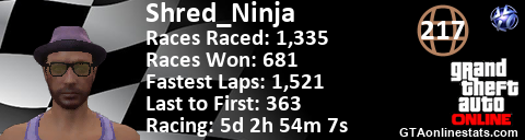 <a href="http://GTAonlinestats.com/showplayer/Shred_Ninja"><img src="http://GTAonlinestats.com/racesignature/Shred_Ninja/sig.png" alt="Shred_Ninja" border="0" /></a>