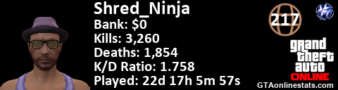 <a href="http://GTAonlinestats.com/showplayer/Shred_Ninja"><img src="http://GTAonlinestats.com/signature/Shred_Ninja/sig.png" alt="Shred_Ninja" border="0" /></a>