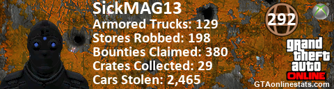 [URL=http://GTAonlinestats.com/showplayer/SickMAG13/2][IMG]http://GTAonlinestats.com/crimesignature/SickMAG13/2/sig.png[/IMG][/URL]