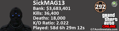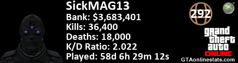 <a href="http://GTAonlinestats.com/showplayer/SickMAG13/2"><img src="http://GTAonlinestats.com/dmsignature/SickMAG13/2/sig.png" alt="SickMAG13" border="0" /></a>