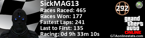 <a href="http://GTAonlinestats.com/showplayer/SickMAG13/2"><img src="http://GTAonlinestats.com/racesignature/SickMAG13/2/sig.png" alt="SickMAG13" border="0" /></a>