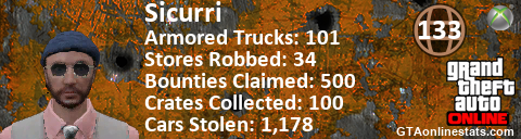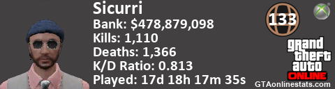 [URL=http://GTAonlinestats.com/showplayer/Sicurri/2][IMG]http://GTAonlinestats.com/greysignature/Sicurri/2/sig.png[/IMG][/URL]