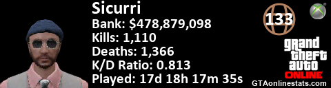 [URL=http://GTAonlinestats.com/showplayer/Sicurri/2][IMG]http://GTAonlinestats.com/signature/Sicurri/2/sig.png[/IMG][/URL]