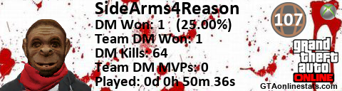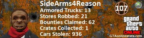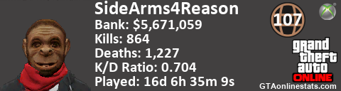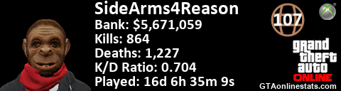 [URL=http://GTAonlinestats.com/showplayer/SideArms4Reason][IMG]http://GTAonlinestats.com/signature/SideArms4Reason/sig.png[/IMG][/URL]