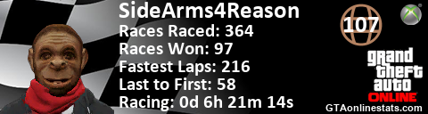 <a href="http://GTAonlinestats.com/showplayer/SideArms4Reason"><img src="http://GTAonlinestats.com/racesignature/SideArms4Reason/sig.png" alt="SideArms4Reason" border="0" /></a>