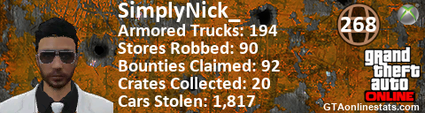 [URL=http://GTAonlinestats.com/showplayer/SimplyNick_][IMG]http://GTAonlinestats.com/randomsignature/SimplyNick_/sig.png[/IMG][/URL]