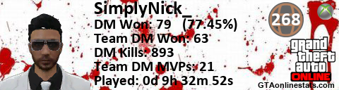 [URL=http://GTAonlinestats.com/showplayer/SimplyNick_][IMG]http://GTAonlinestats.com/dmsignature/SimplyNick_/sig.png[/IMG][/URL]