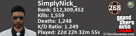 <a href="http://GTAonlinestats.com/showplayer/SimplyNick_"><img src="http://GTAonlinestats.com/signature/SimplyNick_/sig.png" alt="SimplyNick_" border="0" /></a>
