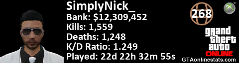 <a href="http://GTAonlinestats.com/showplayer/SimplyNick_"><img src="http://GTAonlinestats.com/dmsignature/SimplyNick_/sig.png" alt="SimplyNick_" border="0" /></a>