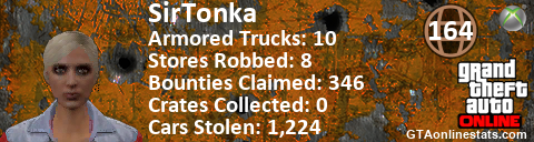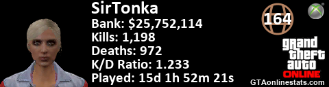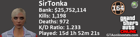 [URL=http://GTAonlinestats.com/showplayer/SirTonka][IMG]http://GTAonlinestats.com/signature/SirTonka/sig.png[/IMG][/URL]