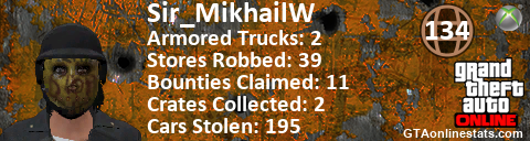 [URL=http://GTAonlinestats.com/showplayer/Sir_MikhailW][IMG]http://GTAonlinestats.com/crimesignature/Sir_MikhailW/sig.png[/IMG][/URL]