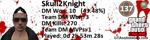 [URL=http://GTAonlinestats.com/showplayer/Skull2Knight][IMG]http://GTAonlinestats.com/dmsignature/Skull2Knight/sig.png[/IMG][/URL]