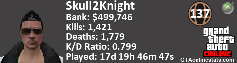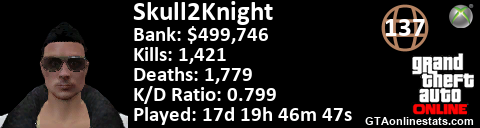 <a href="http://GTAonlinestats.com/showplayer/Skull2Knight"><img src="http://GTAonlinestats.com/dmsignature/Skull2Knight/sig.png" alt="Skull2Knight" border="0" /></a>