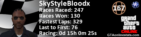 [URL=http://GTAonlinestats.com/showplayer/SkyStyleBloodx][IMG]http://GTAonlinestats.com/racesignature/SkyStyleBloodx/sig.png[/IMG][/URL]