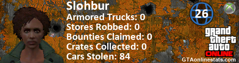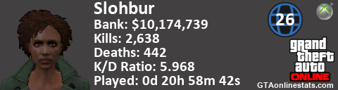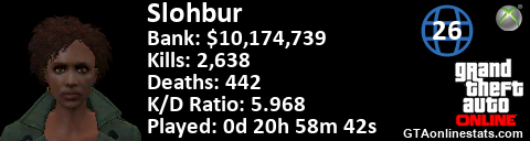 [URL=http://GTAonlinestats.com/showplayer/Slohbur/2][IMG]http://GTAonlinestats.com/signature/Slohbur/2/sig.png[/IMG][/URL]