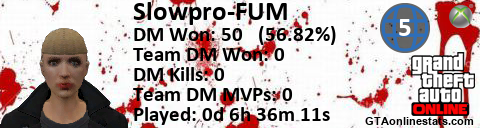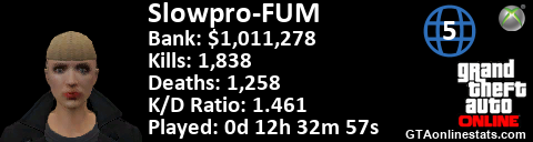 [URL=http://GTAonlinestats.com/showplayer/Slowpro-FUM/2][IMG]http://GTAonlinestats.com/dmsignature/Slowpro-FUM/2/sig.png[/IMG][/URL]