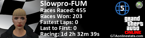 [URL=http://GTAonlinestats.com/showplayer/Slowpro-FUM/2][IMG]http://GTAonlinestats.com/racesignature/Slowpro-FUM/2/sig.png[/IMG][/URL]