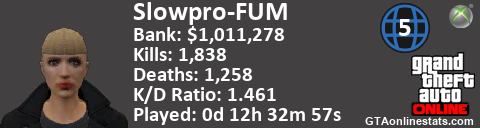 <a href="http://GTAonlinestats.com/showplayer/Slowpro-FUM/2"><img src="http://GTAonlinestats.com/signature/Slowpro-FUM/2/sig.png" alt="Slowpro-FUM" border="0" /></a>