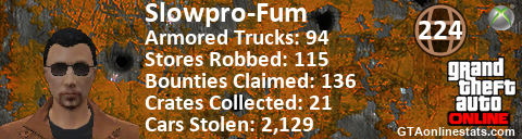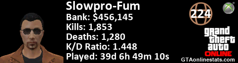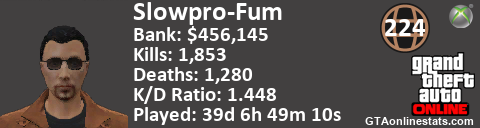 [URL=http://GTAonlinestats.com/showplayer/Slowpro-Fum][IMG]http://GTAonlinestats.com/signature/Slowpro-Fum/sig.png[/IMG][/URL]