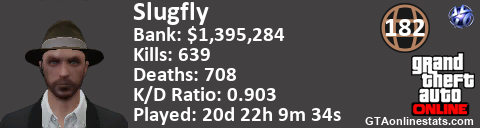 [URL=http://GTAonlinestats.com/showplayer/Slugfly][IMG]http://GTAonlinestats.com/signature/Slugfly/sig.png[/IMG][/URL]