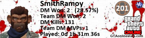 [URL=http://GTAonlinestats.com/showplayer/SmithRamoy][IMG]http://GTAonlinestats.com/dmsignature/SmithRamoy/sig.png[/IMG][/URL]