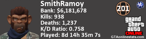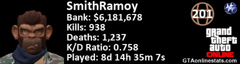 <a href="http://GTAonlinestats.com/showplayer/SmithRamoy"><img src="http://GTAonlinestats.com/signature/SmithRamoy/sig.png" alt="SmithRamoy" border="0" /></a>