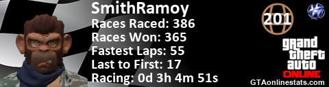 [URL=http://GTAonlinestats.com/showplayer/SmithRamoy][IMG]http://GTAonlinestats.com/racesignature/SmithRamoy/sig.png[/IMG][/URL]
