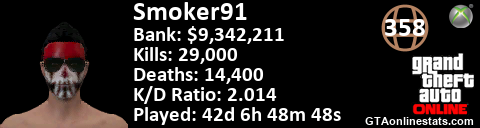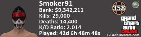 [URL=http://GTAonlinestats.com/showplayer/Smoker91][IMG]http://GTAonlinestats.com/signature/Smoker91/sig.png[/IMG][/URL]