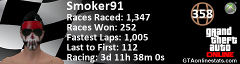 <a href="http://GTAonlinestats.com/showplayer/Smoker91"><img src="http://GTAonlinestats.com/racesignature/Smoker91/sig.png" alt="Smoker91" border="0" /></a>