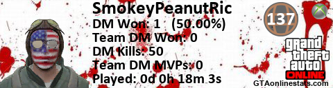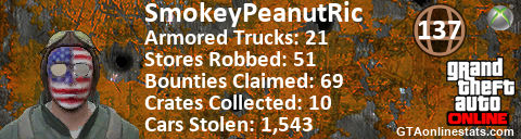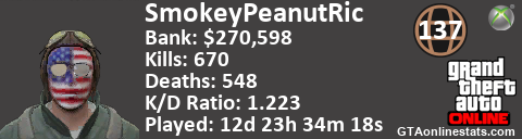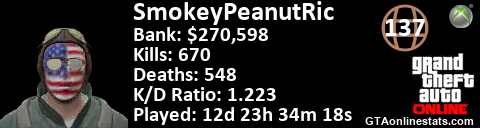 <a href="http://GTAonlinestats.com/showplayer/SmokeyPeanutRic"><img src="http://GTAonlinestats.com/signature/SmokeyPeanutRic/sig.png" alt="SmokeyPeanutRic" border="0" /></a>