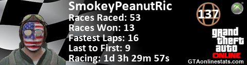 [URL=http://GTAonlinestats.com/showplayer/SmokeyPeanutRic][IMG]http://GTAonlinestats.com/racesignature/SmokeyPeanutRic/sig.png[/IMG][/URL]