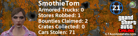 [URL=http://GTAonlinestats.com/showplayer/SmothieTom/2][IMG]http://GTAonlinestats.com/crimesignature/SmothieTom/2/sig.png[/IMG][/URL]