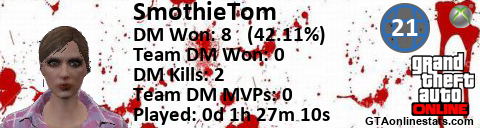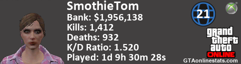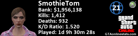 [URL=http://GTAonlinestats.com/showplayer/SmothieTom/2][IMG]http://GTAonlinestats.com/signature/SmothieTom/2/sig.png[/IMG][/URL]