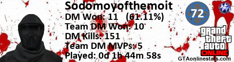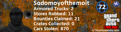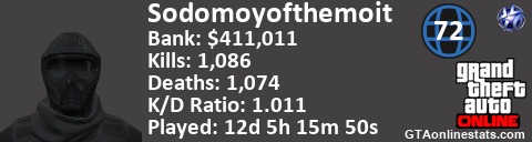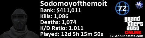 <a href="http://GTAonlinestats.com/showplayer/Sodomoyofthemoit"><img src="http://GTAonlinestats.com/signature/Sodomoyofthemoit/sig.png" alt="sodomoyofthemoit" border="0" /></a>