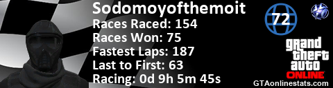 <a href="http://GTAonlinestats.com/showplayer/Sodomoyofthemoit"><img src="http://GTAonlinestats.com/racesignature/Sodomoyofthemoit/sig.png" alt="sodomoyofthemoit" border="0" /></a>