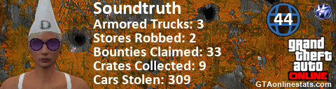 [URL=http://GTAonlinestats.com/showplayer/Soundtruth/2][IMG]http://GTAonlinestats.com/crimesignature/Soundtruth/2/sig.png[/IMG][/URL]