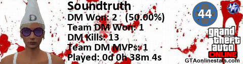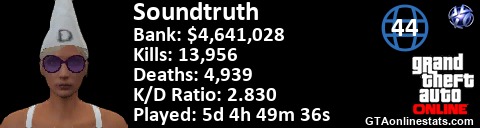<a href="http://GTAonlinestats.com/showplayer/Soundtruth/2"><img src="http://GTAonlinestats.com/dmsignature/Soundtruth/2/sig.png" alt="Soundtruth" border="0" /></a>