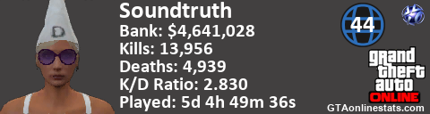 <a href="http://GTAonlinestats.com/showplayer/Soundtruth/2"><img src="http://GTAonlinestats.com/signature/Soundtruth/2/sig.png" alt="Soundtruth" border="0" /></a>