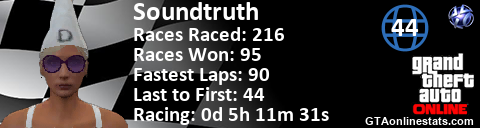 <a href="http://GTAonlinestats.com/showplayer/Soundtruth/2"><img src="http://GTAonlinestats.com/racesignature/Soundtruth/2/sig.png" alt="Soundtruth" border="0" /></a>