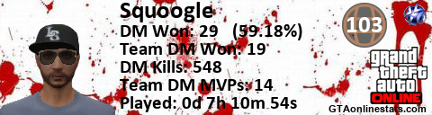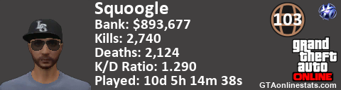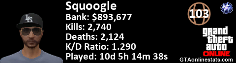 [URL=http://GTAonlinestats.com/showplayer/Squoogle][IMG]http://GTAonlinestats.com/dmsignature/Squoogle/sig.png[/IMG][/URL]