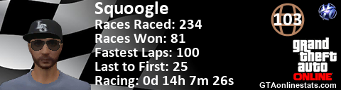 [URL=http://GTAonlinestats.com/showplayer/Squoogle][IMG]http://GTAonlinestats.com/racesignature/Squoogle/sig.png[/IMG][/URL]