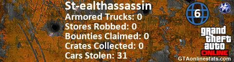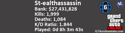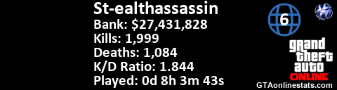 [URL=http://GTAonlinestats.com/showplayer/St-ealthassassin/2][IMG]http://GTAonlinestats.com/signature/St-ealthassassin/2/sig.png[/IMG][/URL]