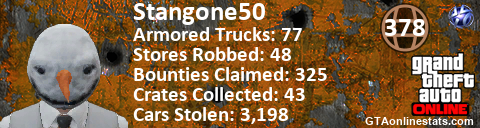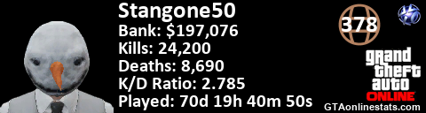 <a href="http://GTAonlinestats.com/showplayer/Stangone50"><img src="http://GTAonlinestats.com/randomsignature/Stangone50/sig.png" alt="Stangone50" border="0" /></a>